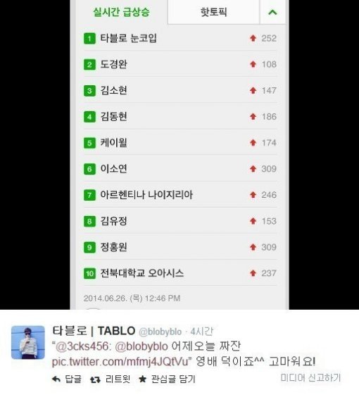 공개된 사진은 포털사이트 검색어 순위를 캡처한 것이다. ‘타블로 눈코입’이 1위를 하고 있다.