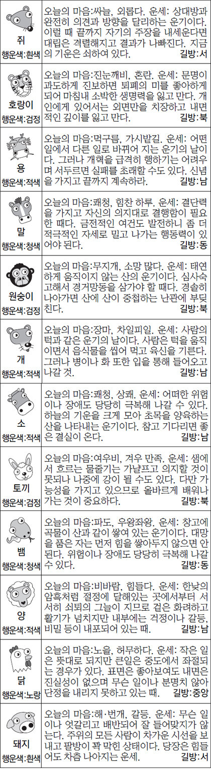 금일복권, 주식, 부동산매입 행운의 띠: 호랑이,말,개(토요일:토끼,양,돼지)