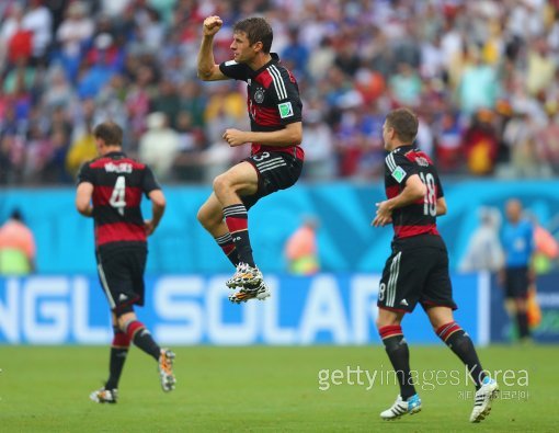 독일의 토마스 뮐러(가운데)가 후반 10분 선제골을 넣은 뒤 환호하고 있다. 이번 대회 개인 4호골.