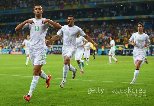 27일(한국시간) 브라질 쿠리치바의 아레나 다 바이사다 경기장에서 열린 2014 브라질 월드컵 조별리그 H조 최종 3차전 알제리-러시아 경기. 알제리의 이슬람 슬리마니(왼쪽)가 후반 15분 동점골을 넣은 뒤 환호하고 있다.