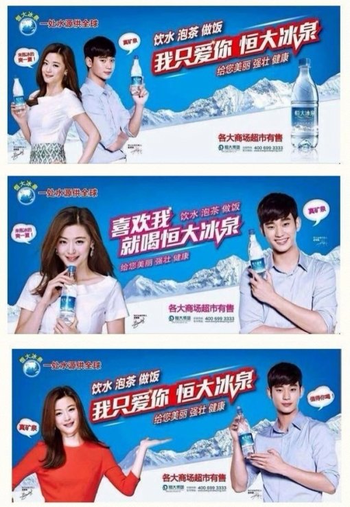 해외 온라인 커뮤니티 사이트 등에는 김수현과 전지현이 촬영한 중국의 생수 브랜드 '헝다빙촨'의 광고 이미지가 게재됐다.