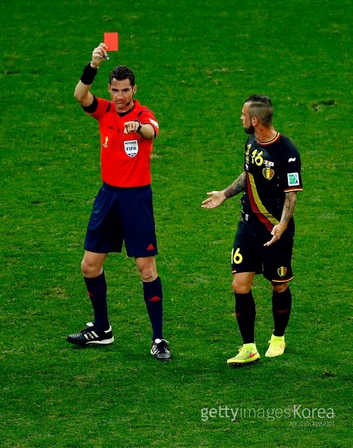 이날 후반 45분 벨기에 미드필더 스테번 드푸르가 김신욱의 발목을 고의로 밟아 주심으로부터 레드카드를 받았다. 드푸르는 억울하다는 제스처를 취했으나 벤저민 윌리엄스 주심은 단호했다.