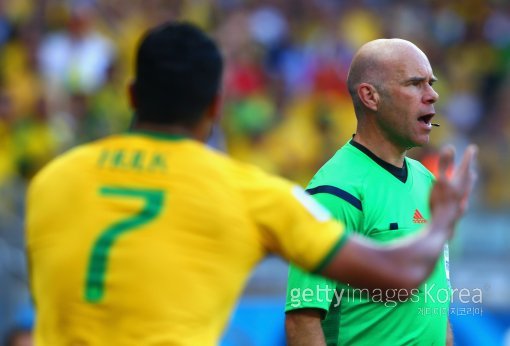 29일(한국시간) 브라질 벨루오리존치의 에스타디오 미네이랑 경기장에서 열린 2014 브라질 월드컵 16강전 브라질-칠레 경기. 브라질의 헐크(FC 제니트 상트 페테르부르크)가 후반 핸드볼 파울로 골이 무산되자 아쉬워 하고 있다. 오른쪽은 하워드 웹 주심.