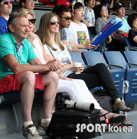 29일 오후 포항야구장에서 열린 ‘2014 한국 야쿠르트 세븐 프로야구’ 삼성 라이온즈와 한화 이글스의 경기에서 삼성 밴덴헐크의 부인 애나가 가족들과 함께 경기를 관람하며 밴덴헐크의 선전을 기원하고 있다.