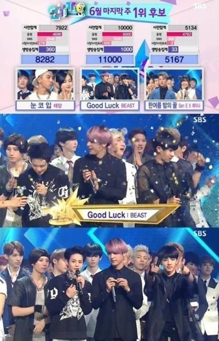 비스트는 29일 방송한 SBS ‘인기가요’에서 태양, 산이&레이나와 함께 1위 후보에 올라 정상을 차지했다. 비스트는 1위 소감에서 "이 상을 준 뷰티(팬클럽)에게 고맙고, 부모님, 관계자 분들께 감사하다”고 전했다.