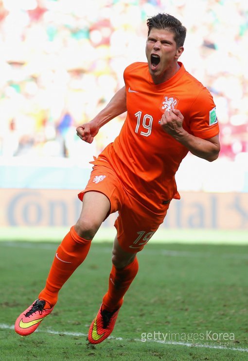네덜란드의 클라스 얀 훈텔라르(샬케 04)가 후반 추가시간 때 페널티킥을 성공시킨 뒤 환호하고 있다.