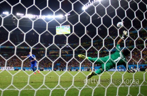 골키퍼 나바스(코스타리카)가 30일(한국시각) 브라질 헤시피의 아레나 페르남부쿠에서 열린 그리스전 PK 에서 게카스의 슛을 막아내고 있다.