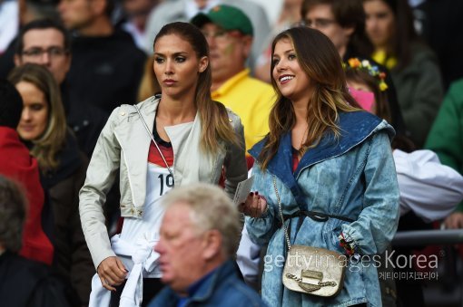 1일(한국시간) 브라질 포르투 알레그리의 에스타디오 베이라-리오 경기장에서 열린 2014 브라질 월드컵 16강전 독일-알제리 경기. 독일 대표팀 마리오 괴체의 여자친구인 앤 캐스린 브로멀(왼쪽)과 안드레 쉬를레의 여자친구인 몬타나 요크가 경기장을 찾은 모습.