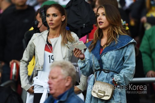 1일(한국시간) 브라질 포르투 알레그리의 에스타디오 베이라-리오 경기장에서 열린 2014 브라질 월드컵 16강전 독일-알제리 경기. 독일 대표팀 마리오 괴체의 여자친구인 앤 캐스린 브로멀(왼쪽)과 안드레 쉬를레의 여자친구인 몬타나 요크가 경기장을 찾은 모습.