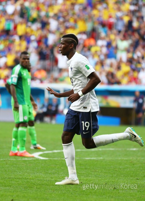 1일(한국시간) 브라질 브라질리아의 에스타디오 나시오날 데 브라질리아 경기장에서 열린 2014 브라질 월드컵 16강전 프랑스-나이지리아 경기 장면. 프랑스의 폴 포그바(유벤투스)가 후반 34분 선제골을 넣은 뒤 기뻐하고 있다.
