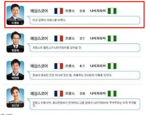 이영표 KBS 해설위원이 프랑스 나이지리아전 스코어 및 경기 흐름을 정확하게 짚어냈다.