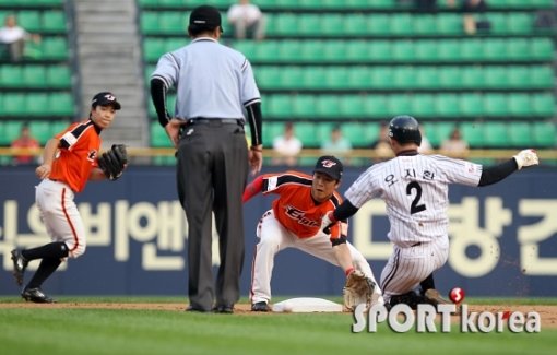 오지환, 정근우에게 태그아웃 ‘도루 실패!’