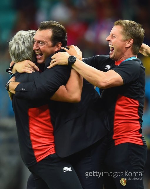 마르크 빌모츠 벨기에 감독(가운데)이 팀 승리 확정 후 코칭스태프와 기뻐하고 있다.
