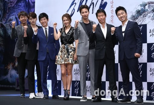 배우 김태우(왼쪽부터), 이이경, 김원해, 손예진, 김남길, 유해진, 조달환이 2일 오전 서울시 광화문 나인트리컨벤션에서 열린 영화 ‘해적:바다로 간 산적’ 제작보고회에서 포토타임을 하고 있다.