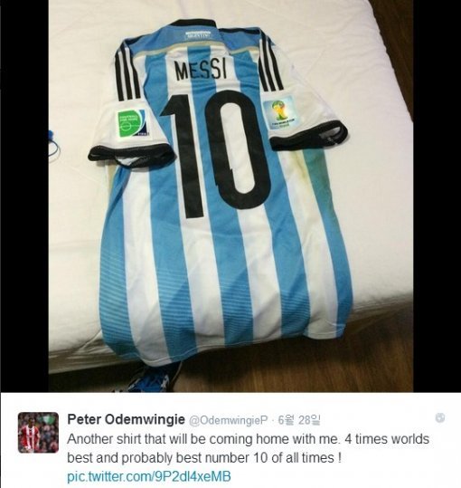 공개된 사진에는 오뎀윙기가 2014 브라질 월드컵에서 메시와 바꿔 입은 셔츠가 담겨 있다.