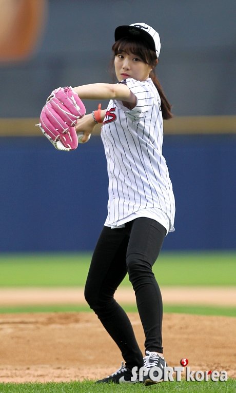3일 서울 잠실구장에서 열린 ‘2014프로야구’ LG 트윈스와 한화 이글스의 경기에서 개그우먼 허민이 시구하고 있다. 시타는 이동윤이 맡았다.