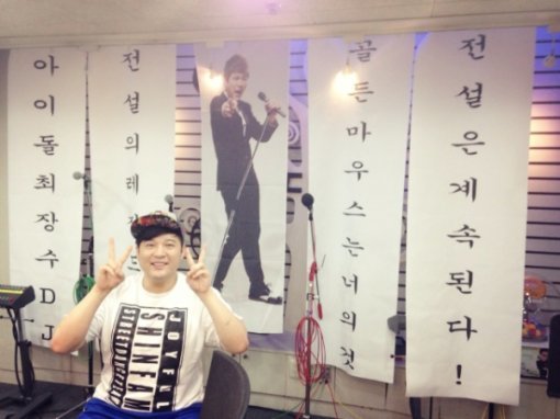 사진에는 신동이 라디오 부스 안에서 포즈를 취하고 있는 모습이 담겨있다. 그의 뒤로는 ‘전설은 계속된다’ ‘골든 마우스는 너의 것’ ‘전설의 레전드’ ‘아이돌 최장수 DJ’라는 문구가 담긴 플랜카드들이 걸려 있어 애정을 느낄 수 있게 한다.