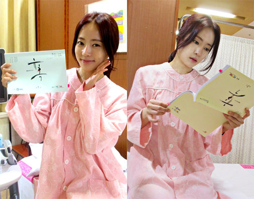 사진 속 윤아정은 환자복 차림으로 ‘유혹’ 대본을 살피며 첫 촬영 준비에 열중하는 모습이다. 또 다른 사진에서는 한 손으로 대본을 들고 그동안 작품에서 볼 수 없었던 상큼한 미소를 짓고 있다.