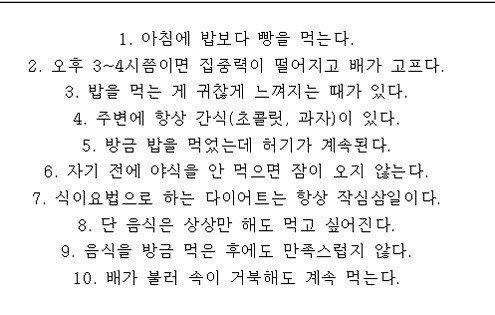탄수화물 중독 테스트에는 총 10가지 항목이 있다. 이 중 5가지 이상에 해당되면 탄수화물 중독을 의심해야 한다.
