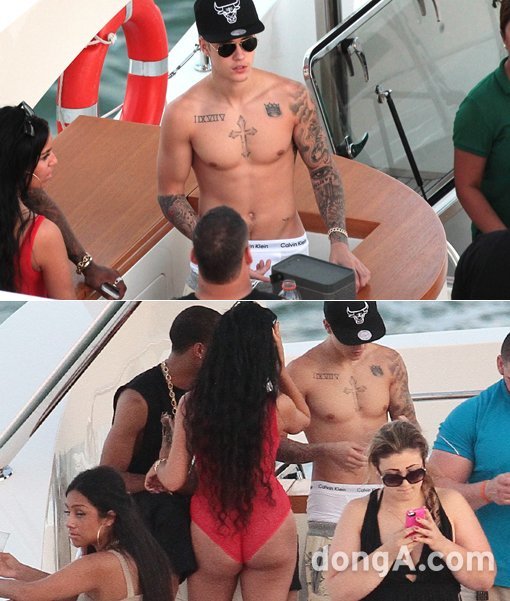 공개된 사진에는 저스틴 비버 일행이 요트 위에서 음주 파티를 즐기는 모습이 담겨 있다. 특히 저스틴 비버는 상의를 탈의한 채 바지는 속옷이 보일 정도로 내려입은 상태다.