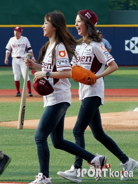 4일 오후 서울 목동야구장에서 열린 ‘2014 프로야구’ 넥센 히어로즈 대 KIA 타이거즈 경기전 걸그룹 EXID의 정화와 하니가 멋진 시구시타를 선보인 후 미소를 지으며 그라운드를 빠져나가고 있다.