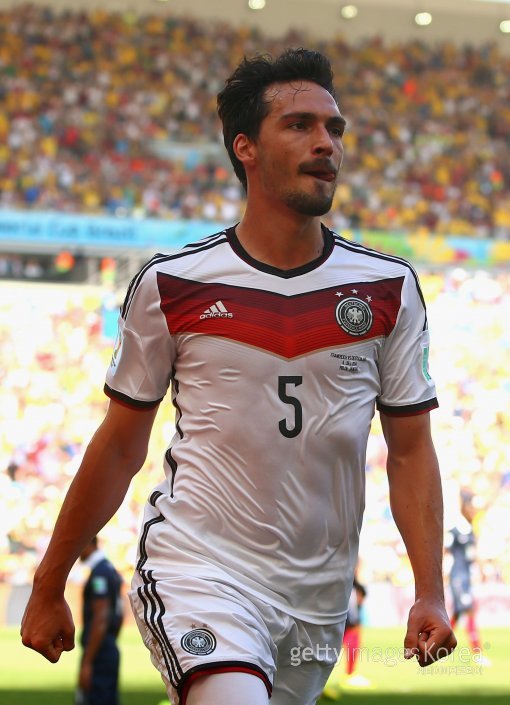 5일(한국시간) 브라질 리우데자네이루의 에스타디오 두 마라카낭 경기장에서 열린 2014 브라질 월드컵 8강전 프랑스-독일 경기. 독일의 마츠 훔멜스(보루시아 도르트문트)가 전반 13분 선제골을 넣은 뒤 기뻐하고 있다.