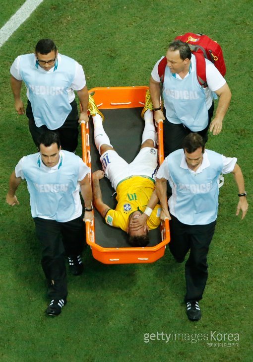 브라질의 네이마르(FC 바르셀로나)가 후반 43분 콜롬비아의 후안 카밀로 수니가(SSC 나폴리)와 볼 다툼 과정에서 부상을 당해 들것에 실려 그라운드를 빠져 나가고 있다.