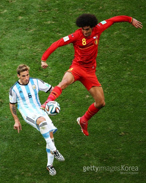 6일(한국시간) 브라질 브라질리아의 에스타디오 나시오날 데 브라질리아 경기장에서 열린 2014 브라질 월드컵 8강전 아르헨티나-벨기에 경기. 벨기에의 마루안 펠라이니(오른쪽·맨체스터 유나이티드)가 상대 선수에 앞서 볼을 따내고 있다.