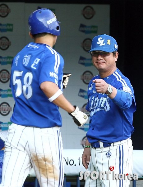 6일 오후 서울 잠실야구장에서 열린 ‘2014 한국 야쿠르트 세븐 프로야구’ 두산 베어스와 삼성 라이온즈의 경기 2회초 1사 1, 3루 상황에서 삼성 김상수의 땅볼 때 홈으로 쇄도해 득점에 성공한 3루 주자 박해민을 류중일 감독이 환영해주고 있다.