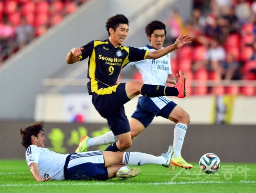 6일 저녁 경기도 성남 탄천 종합운동장에서 열린 K리그 클래식 성남FC와 울산현대의 경기에서 울산 이재원이 성남 김동섭의 슛팅에 앞서 태클로 저지하고 있다.