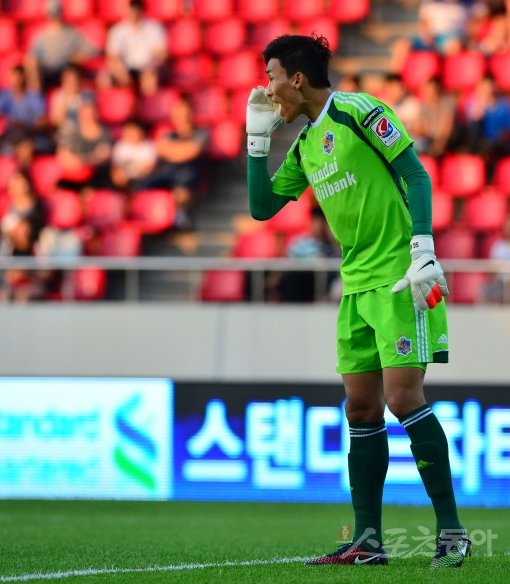 6일 저녁 경기도 성남 탄천 종합운동장에서 열린 K리그 클래식 성남FC와 울산현대의 경기에서 울산 김승규가 동료들의 움직임을 지시하고 있다.