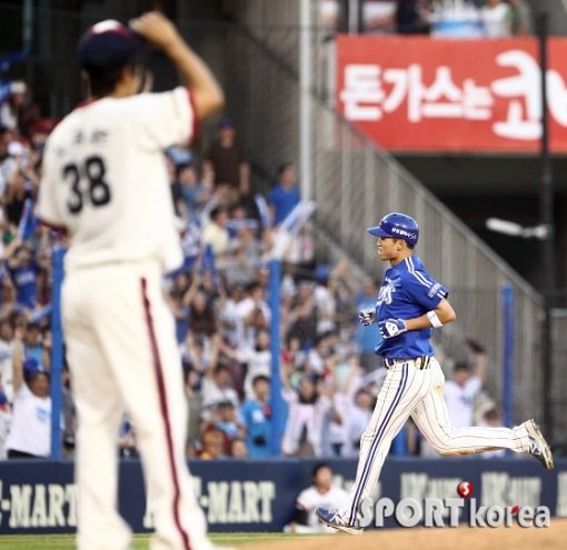 6일 오후 서울 잠실야구장에서 열린 ‘2014 한국 야쿠르트 세븐 프로야구’ 두산 베어스와 삼성 라이온즈의 경기 6회초 2사 1루 상황에서 삼성 박해민이 두산 노경은에게 데뷔 첫 홈런(2점)을 친 후 그라운드를 돌고 있다.