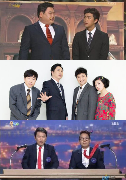 지난해 말 시청률 20%에 육박하던 KBS 2TV ‘개그콘서트’는 최근 13∼14%대로 시청률이 하락한 가운데 현실 세태를 풍자하는 코너를 대거 무대에 올리고 있다. 국회 청문회장을 연상케 하는 ‘우리 동네 청문회’와 국회의원을 주인공으로 앞세운 ‘존경합니다’, 직장생활의 고달픔을 담은 ‘렛잇비’와 30초마다 기억을 잃는 닭들에 현실을 비유한 ‘닭치고’ 등이 호응을 얻고 있다.