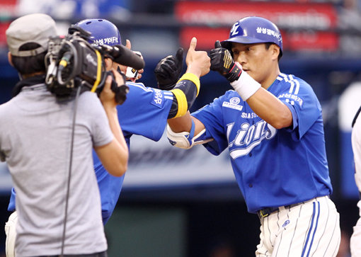삼성 이승엽(오른쪽)이 5일 잠실 두산전에서 결승 2점홈런을 날린 뒤 후배 박석민과 세리머니를 하고 있다. 이승엽은 올해도 어김없이 전 구단 상대 홈런을 기록하면서 ‘전국구 홈런왕’임을 입증했다. 사진제공|스포츠코리아