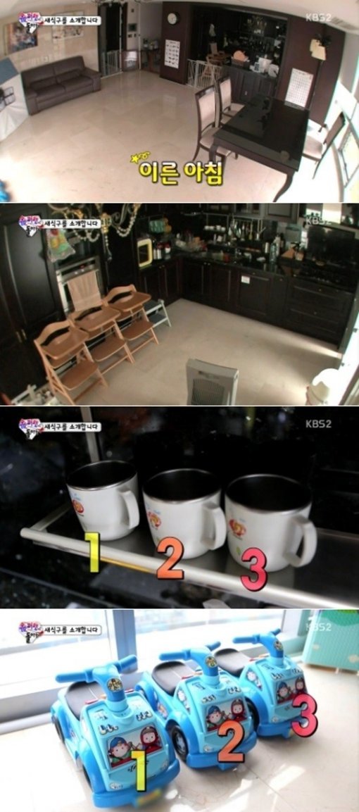 이날 공개된 송일국의 집에는 의자를 비롯해 컵과 자동차 등 유아용품이 3개씩 놓여 있었다. 이는 송일국의 세쌍둥이 자녀인 대한, 민국, 만세를 위한 것.
