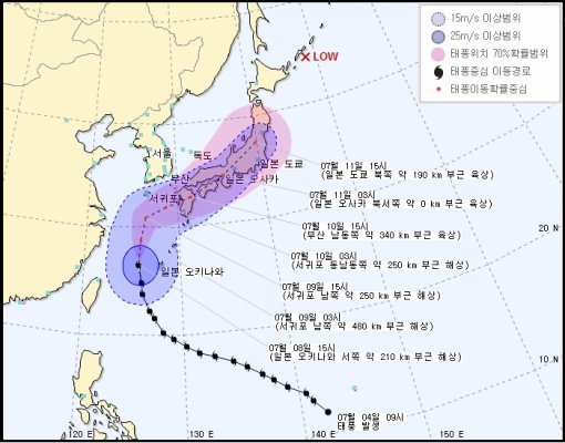 너구리는 일본 오키나와 남서쪽 약 240㎞ 해상에서 북진하고 있는 것으로 알려졌다.