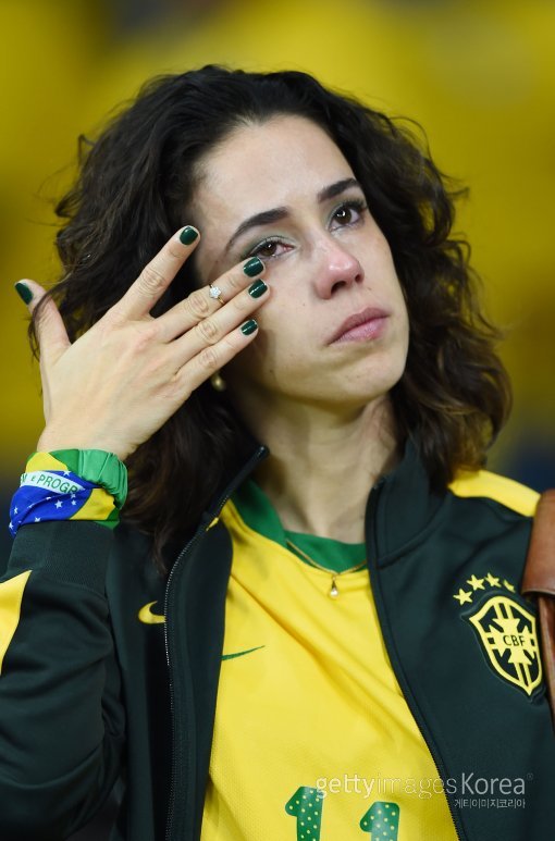 9일(한국시간) 브라질 벨루오리존치의 에스타디오 미네이랑 경기장에서 열린 2014 브라질 월드컵 4강전 브라질-독일 경기. 한 브라질 여성 팬이 경기 도중 눈물을 흘리고 있다.