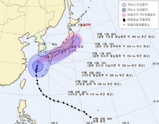 9일과 10일 사이에는 태풍의 직·간접적인 영향으로 제주도와 남해안, 경남 동해안에 시간당 30㎜ 이상의 많은 비가 내릴 것으로 보인다고 기상청은 내다봤다.