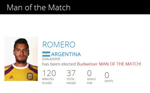 승부차기에서 두 차례 선방으로 팀을 결승에 올려놓은 아르헨티나 대표팀 골키퍼 세르히오 로메로(27·AS모나코)가 국제축구연맹(FIFA) 경기 최우수선수(Man of the Match)로 선정됐다.