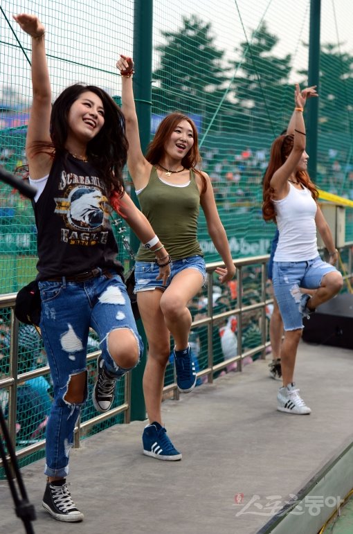 10일 충북 청주야구장에서 ‘2014 한국야쿠르트 세븐 프로야구’ 한화 이글스와 넥센 히어로즈의 경기가 열렸다. 한화 치어리더가 화려한 공연을 선보이고 있다.