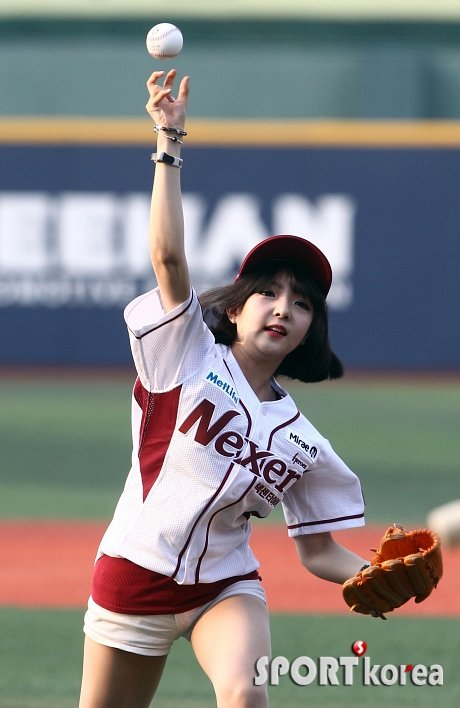 11일 오후 서울 목동야구장에서 열린 ‘2014 한국 야쿠르트 세븐 프로야구’ 넥센 히어로즈와 NC 다이노스의 경기에 앞서 걸그룹 단발머리 유정이 시구를 하고 있다.