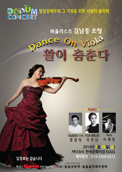 이번 서울공연 연주자로 나서는 김남중은 ‘활이 춤춘다(Dance on the Viola)’라는 주제로 피아니스트 이재완과 호흡을 맞춰 슈만의 환상모음곡, 비외탕의 비올라 소나타, 비틀즈의 ‘오브라디 오브라다’ 등을 연주한다. 인기 TV 프로그램 ‘댄싱9’의 이루다, 국립발레단 수석발레리노 정영재와의 협연도 펼쳐진다.