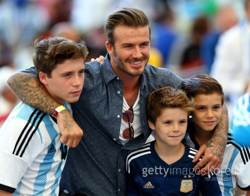 14일(한국시간) 브라질 리우데자네이루의 에스타디오 두 마라카낭 경기장에서 열린 2014 브라질 월드컵 결승전 독일과 아르헨티나의 경기. 전 잉글랜드 대표팀 출신의 데이비드 베컴이 자신의 아들들과 경기장을 찾아 포즈를 취하고 있다.