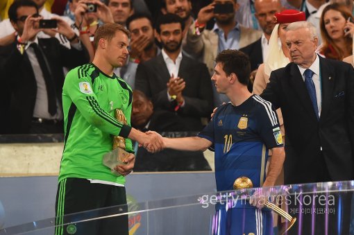 14일(한국시간) 브라질 리우데자네이루의 에스타디오 두 마라카낭 경기장에서 열린 2014 브라질 월드컵 결승전 독일과 아르헨티나의 경기가 끝난 후 열린 시상식에서 골든볼 수상자 리오넬 메시(FC 바르셀로나)가 골든 글러브 수상자인 독일의 마누엘 노이어(바이에른 뮌헨)와 악수하고 있다.