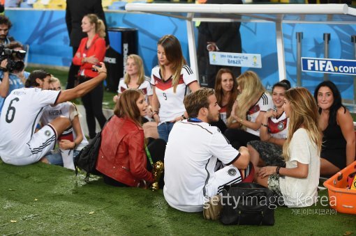 14일(한국시간) 브라질 리우데자네이루의 에스타디오 두 마라카낭 경기장에서 열린 2014 브라질 월드컵 결승전 독일과 아르헨티나의 경기가 끝난 후 독일 대표팀 마리오 괴체(바이에른 뮌헨)의 여자친구인 앤 캐스린 브로멀(오른쪽) 등 독일 선수들의 여자친구들이 함께 모여 시간을 보내고 있다.
