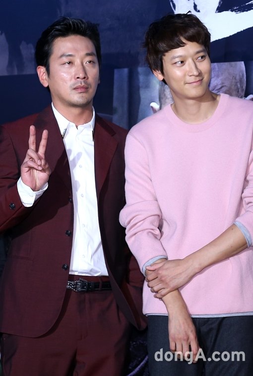 배우 하정우(왼쪽), 강동원이 14일 오후 서울시 강남구 코엑스 메가박스에서 열린 영화 ‘군도: 민란의 시대’ VIP시사회에서 포토타임을 하고 있다.