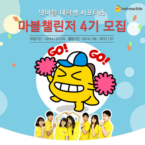 게임을 좋아하는 수도권 거주 대학생 및 휴학생이라면 누구든 참여 가능하다. 넷마블 공식 블로그(blog.netmarble.net)에서 신청서를 내려 받아 작성한 뒤 이메일(marblec@cj.net)로 접수하면 된다. 넷마블은 서류 및 면접 전형을 진행한 뒤 최종 합격자를 선발할 예정. 마블챌린저 4기로 뽑힌 학생들은 8월부터 약 6개월간에 걸쳐 각종 게임 행사 기획 및 실행, PC온라인 및 모바일게임 리뷰, 넷마블 실무자들과의 멘토링 등 다양한 활동을 수행하게 된다.