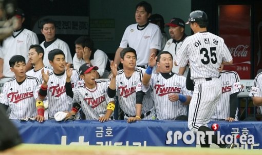 15일 오후 서울 잠실야구장에서 열린 ‘2014 프로야구’ LG 트윈스 대 삼성 라이온즈 경기 2회말 1사 만루에서 LG 최경철의 밀어내기 볼 넷으로 홈을 밟은 3루주자 이진영이 덕아웃 동료선수들의 환영을 받고 있다.