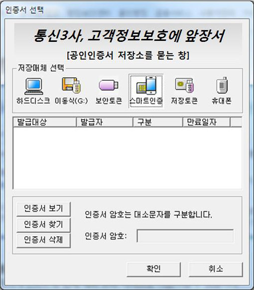 스마트인증은 스마트폰에 장착된 유심칩에 공인인증서를 저장하고 전자서명을 하는 차세대 공인인증서비스다. 특히 스마트폰 유심과 공인인증서를 일체화함으로써 외부 복제가 불가능해 보안성이 우수하다는 게 통신 3사의 설명이다.