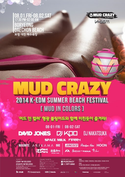 8월1·2일 충남 보령 대천해수욕장에서 열리는 EDM(일렉트로닉 댄스뮤직)페스티벌 ‘머드 크레이지 2014 K-EDM 썸머 비치 페스티벌’(이하 ‘머드 크레이지’)이 내년 일본에서도 개최된다.
